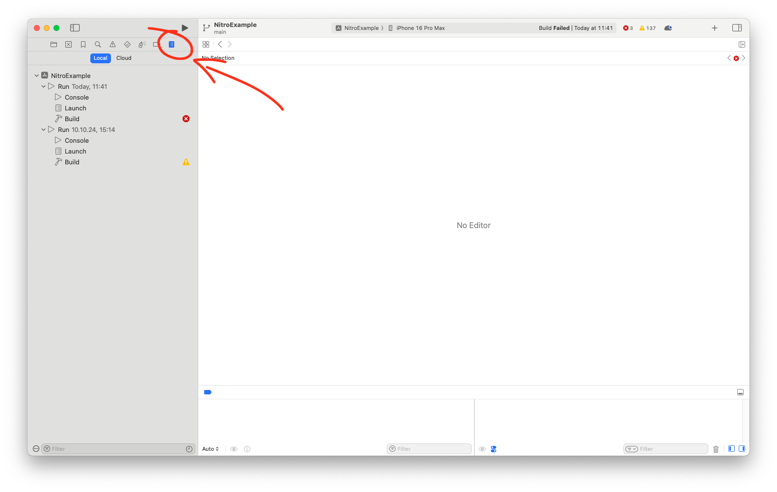 When the build fails in Xcode, open the "Report Navigator" tab from within the left sidebar: